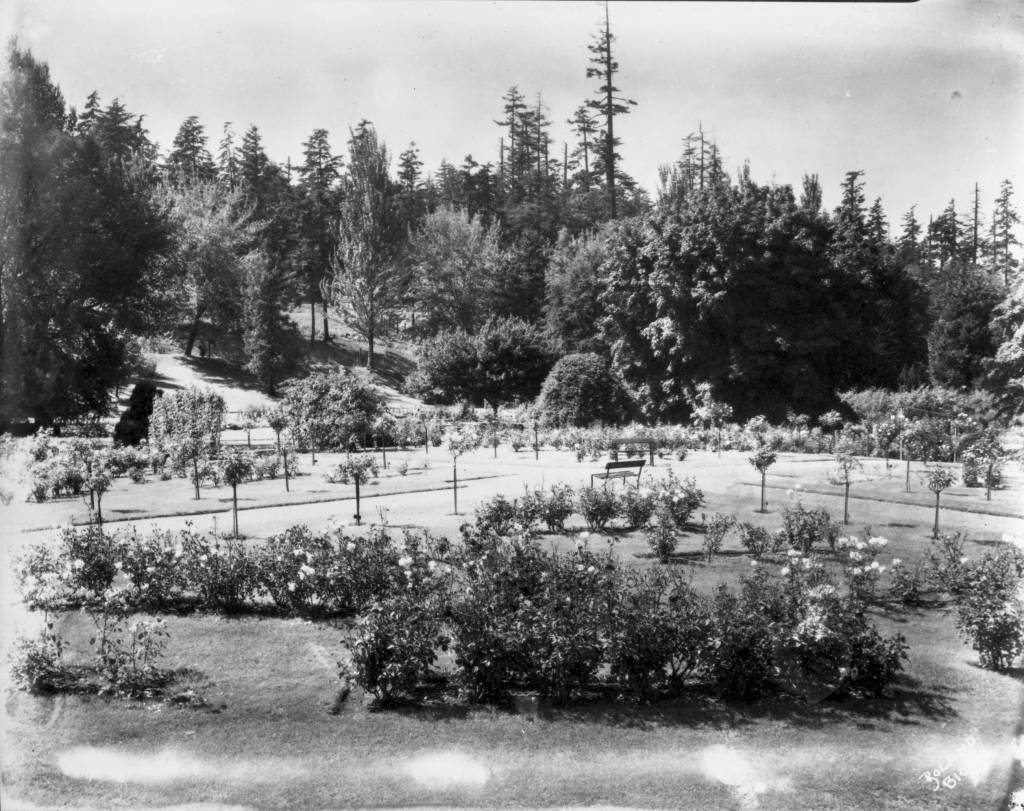 The first official design of the rose gardens (once referred to as the Rose Arbor) was put together by Sidney J. Hare in 1902. The garden you see today at Point Defiance featuring the arc like rows of roses labeled so visitors would know the name of their favorite plants is an enlarged version of G.A. Hill’s design from 1912. Many of these early plantings in the formal garden were from the cuttings brought in by the school children in the 1890s.