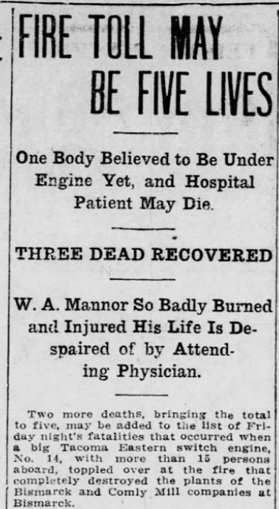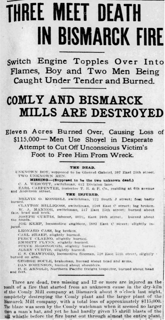Walker Foster, the owner of the Bismarck Lumber Mill, planned to rebuild. He said, “One of the worst features of the blaze is that it will throw 100 of our old employees and 50 men from the camp out of employment.”
