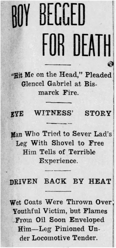Meanwhile, rescuers like Daniel Sorenson ran to attend to Glencel Gabriel, who was screaming in agony. Beaten back by intense heat, the rescuers soaked heavy leather coats in water from the ditch, covered their heads, and ran back toward the tender. There, Gabriel was pinned with his right leg from the thigh down, his left foot and his right hand by several tons of steel and the weight of water that issued from the toppled tender. Weaver ran in and managed to free the boy’s left foot, but a shovel would be necessary to free the boy’s right leg. The boy begged Weaver to cut his leg off. Weaver, overcome by the heat, ran back out again. The seventeen-year-old Gabriel shrieked for help as oil pouring from the tender surrounded him. Coats soaked in water were tossed on the youngster to protect his face and back from the flames that danced about his head. Joining the rescuers were John Brown and Ralph Richardson who ran to the nearest fire hose. They demanded the firefighters train the spray on the locomotive tender while the rescue of the teen continued. Assistant Fire Chief Otto Schlegel ordered the men to retreat instead. The fire had become so intense that it burned completely through several fire hoses.