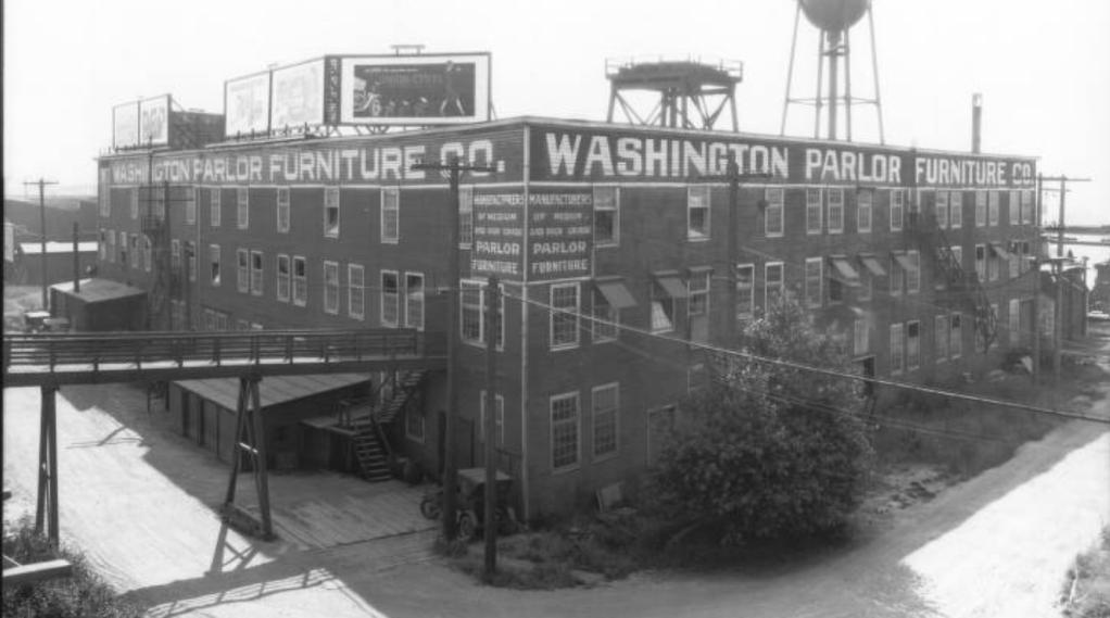 The Washington Parlor Furniture Company was located at what is now roughly the corner of 11th and East D Street, just across the Foss Waterway from downtown at the base of the 11th Street Bridge. The building still stands, and I have spent hours staring at it, fascinated by its obviously hard life and strong bones.
