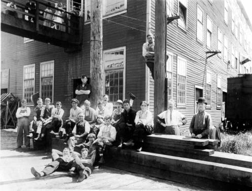 So, in between writing policies and procedures, checking packing lists against equipment deliveries, and hiring scientists, I picked out historic photographs. Some to hang on the walls for all to see, some for my boss’ office, some for my own desk. The one that I chose for my own desk, after browsing the Tacoma Library’s Image Archive, was a picture of a three-story, wood-framed building with lots of windows – every one of them four panes across and six panes down. The image, dated ca. 1916, featured several young men, employees of business which occupied the building, posing for the camera near a corner of the building’s exterior.