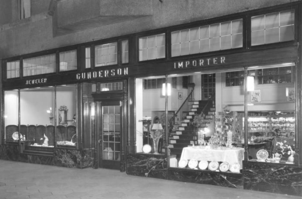 I imagine the day he walked into the shop on Broadway, with ‘GUNDERSON’ in large gold-painted block letters above the door, and ‘JEWELER’ and ‘IMPORTER’ in slightly smaller letters above the huge plate-glass windows to the left and right, respectively. Imagine him browsing, until his eye is caught by this big blue stone, which so obviously reminded him of his wife’s beautiful eyes, which had just been reborn in their new son.