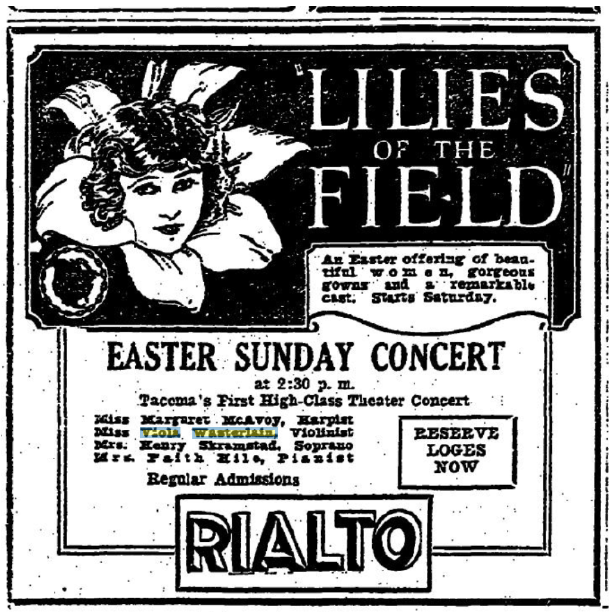 April 17, 1924, The “Lillies of the Field” was an Easter Sunday concert premiering at the Rialto Theater, a show that would be referred to as “Tacoma’s First High-Class Theater Concert.” This musical gathering would feature a number of Tacoma’s valued musicians, including Viola herself. The concert began at 2:30 pm and required seats to be reserved in advance, with the promise of “beautiful women” and “gorgeous gowns.” The news clipping featured a lily flower, with the head of a woman sitting in the middle.