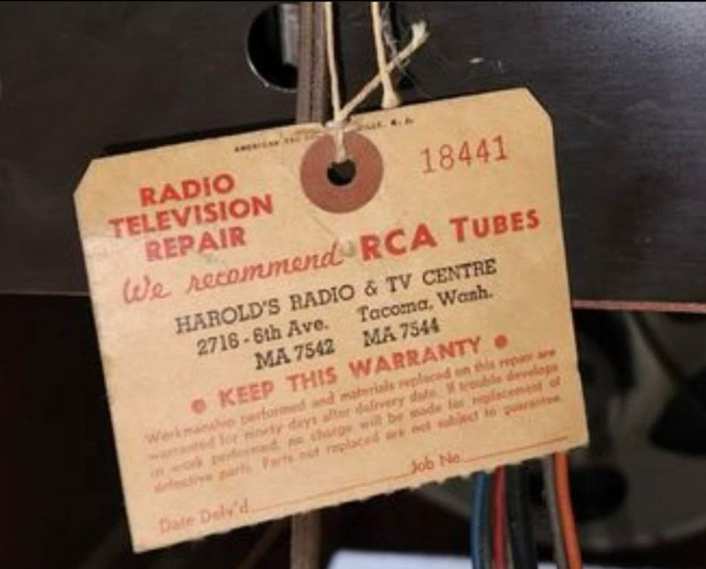 Thanks to one of our followers, Jason Bisig, for sharing the following photographs with us. He recently purchased this 1950s-era combination TV/radio/turntable unit and was curious to learn more about the Tacoma business where it was originally sold, as documented by the still-intact tag.